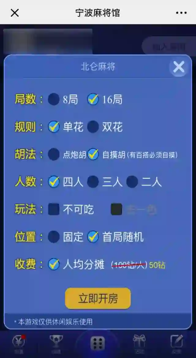 欣欣所热衷的游戏《宁波麻将馆》,采取的就是“房卡模式”。这一模式诞生到普及也不过3年的时间,却给棋牌游戏行业带来了一个又一个的暴利神话。