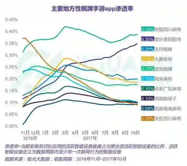 第三方调研机构极光大数据所公布的《2017年中国地方性特色棋牌游戏研究报告》显示,闲徕互娱旗下的《熊猫四川麻将》高居手游App渗透率榜首,达到了0.39%;而排行榜中下一款四川本地的麻将游戏《皮皮四川麻将》,渗透率仅有0.09%,相比之下前者在四川的麻将棋牌游戏中几乎达到了垄断的位置。