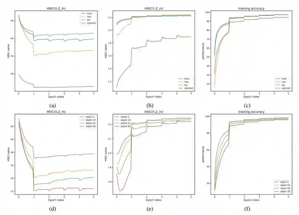 这些实验展示了,在传统反向传播训练过程中,随着网络激活函数 (2a)-(2c) 和深度 (2d)-(2f) 的变化,HSIC-bottleneck 数量 HSIC(X, ZL) 和 HSIC(Y, ZL) 的变化,以及训练准确率的变化。