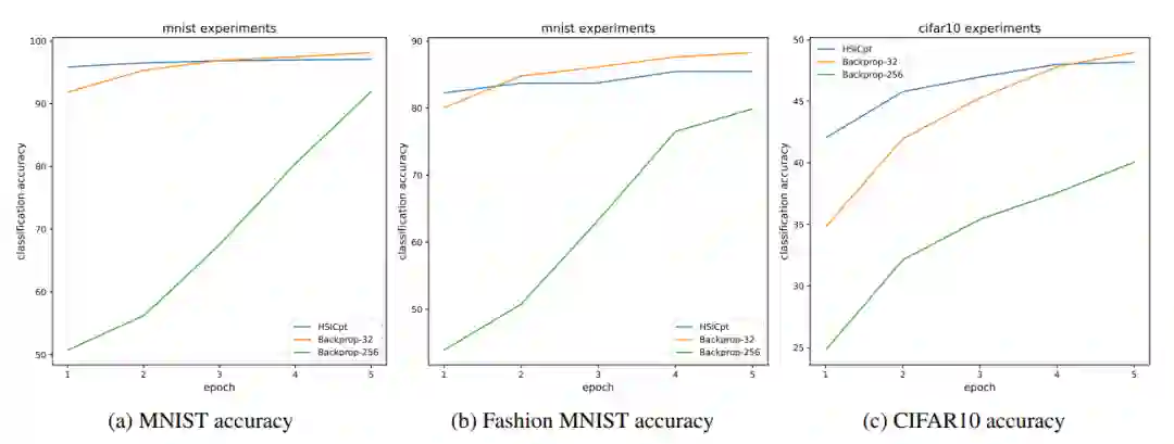 在对比实验中,研究者在 MNIST/Fashion MNIST/CIFAR-10 数据集上训练前馈网络,并分析了 HSIC-bottleneck 在处理经典分类任务上的表现。