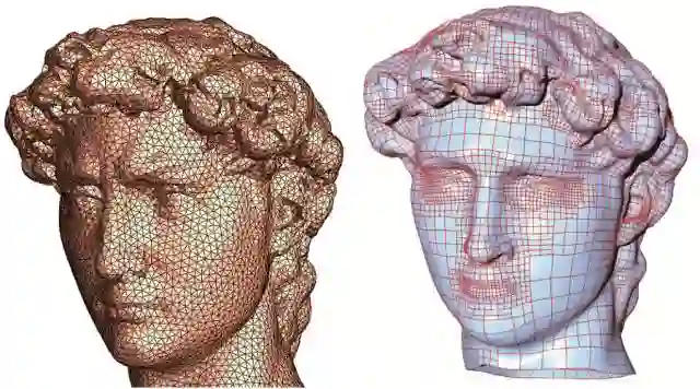 如此而言,四边形网格生成应该是被充分研究过的成熟问题。并且,将一张曲面转换成四边形网格应该非常符合人类直观。任何一位高中生都可以手工将三角网格变换成四边形网格,三维人脸曲面的四边形网格化是建模师的基本技能之一。但是,在曲面上合理布线,将曲面切割成四边形网格,更多地是一种艺术,而非是一种技术。在目前众多的算法中,几乎所有的算法都需要用户介入进行手工调整,似乎人的“灵性”不可或缺。对于这一问题的深入理解,关键在于和乐群的概念【4】。