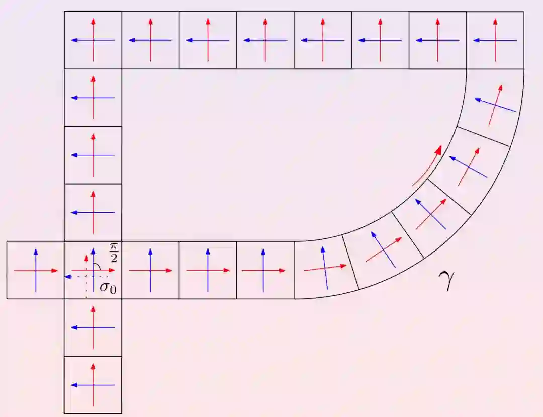 条件3. 和乐群(Holonomy Group)如图4所示,我们在四边形网格上定义面路径,就是一系列四边形的面组成的路途,相邻的两个四边形有一条公共边。如果路径封闭,则我们得到一个面封闭路径。如图5所示,我们可以沿着一条面封闭路径平行移动一个标架,回到起点时,标架相差一个旋转。旋转角度为,这里k是整数,即得到此面封闭路径的和乐(holonomy)。