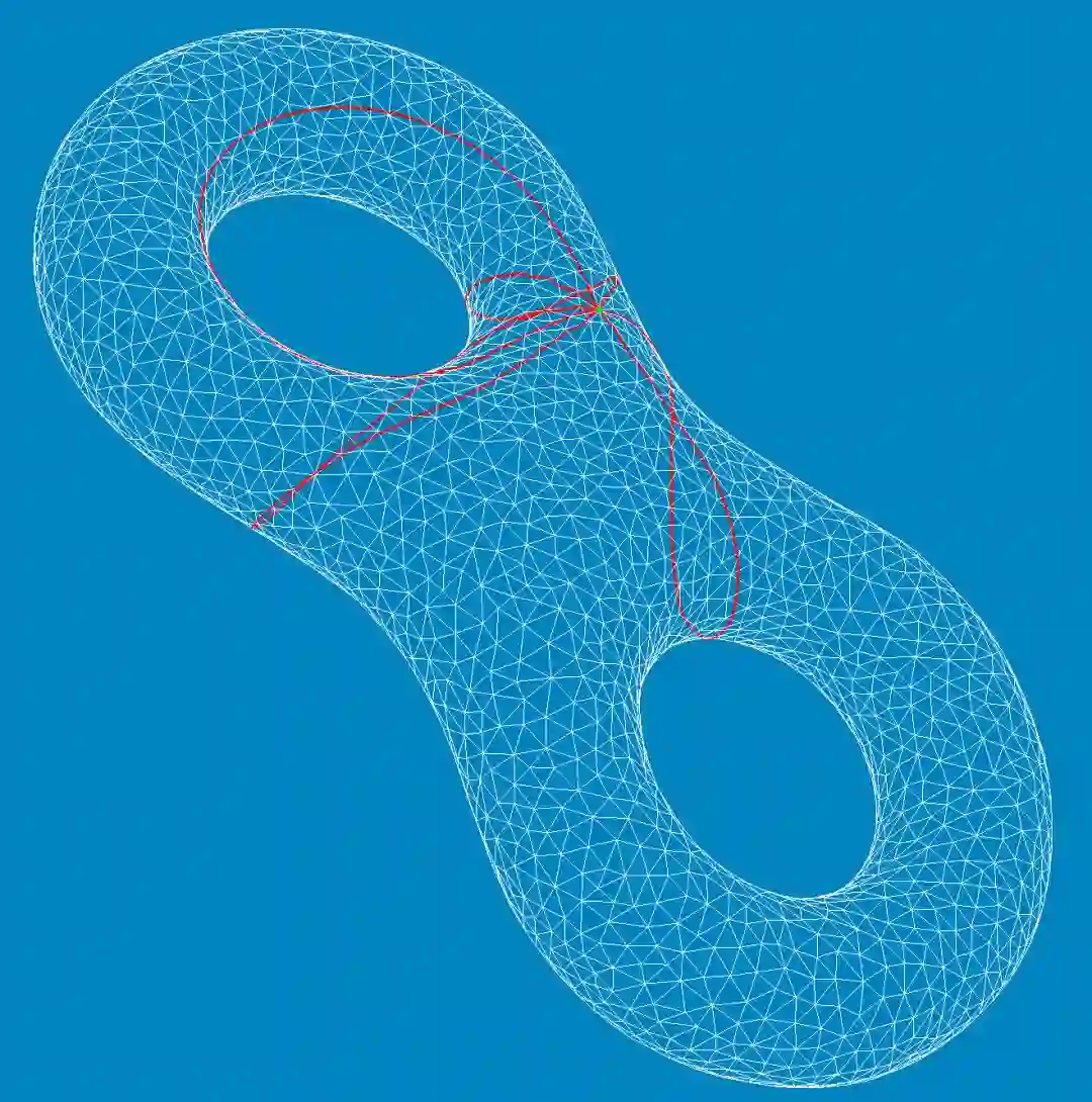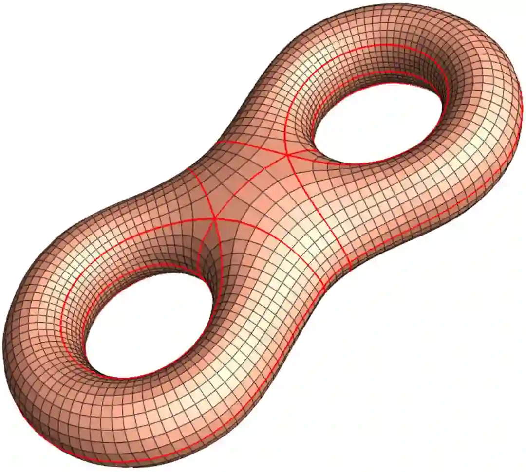 如图6所示,我们设计亏格为2的曲面上的一个平直度量,带有唯一的奇异点,奇异点处的曲率为,其他各点曲率为0。图中红色曲线为过奇异点的测地封闭曲线。这个度量的和乐群不是