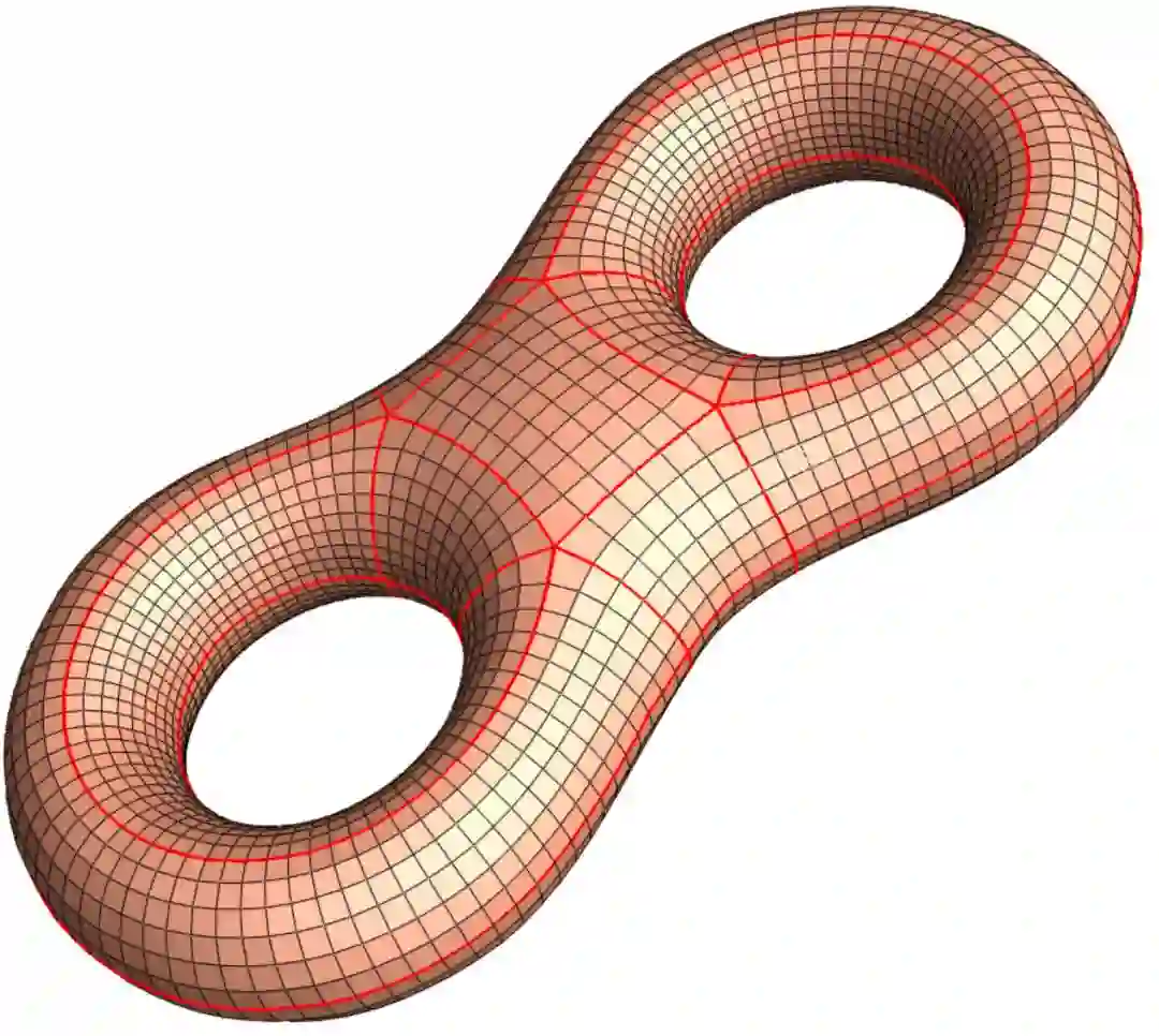 条件2. 高斯-博纳 (Gauss-Bonnet)每个面有4个顶点,每个顶点和多个面相邻。我们将和一个顶点相邻的面的数目称为这个顶点的度(degree),度为4的顶点为正常顶点(normal vertx),度不等于4的顶点成为奇异点(singularity)。正常顶点的邻域是平的,其曲率为0;奇异点的邻域是弯曲的,其曲率等于4减去顶点的度乘以。由高斯博纳定理,曲面的总曲率为拓扑不变量,因此我们要求所有奇异点的曲率之和等于