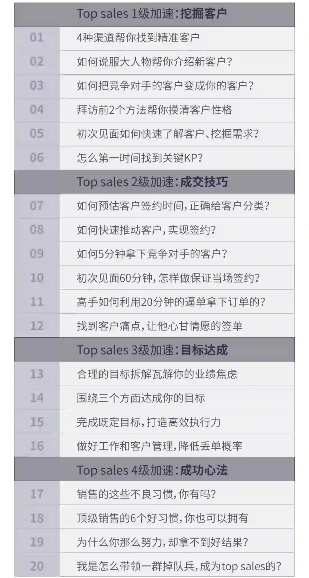 他花费一年时间,还原自己拿下“阿里中供全球双冠王”的方法,打造出这门不同于“学院派销售理论”,而是适配真实销售场景,能够有效落地(好比像李敏一样“直接搬用销售话术”)的“Top Sales强实战课程”:
