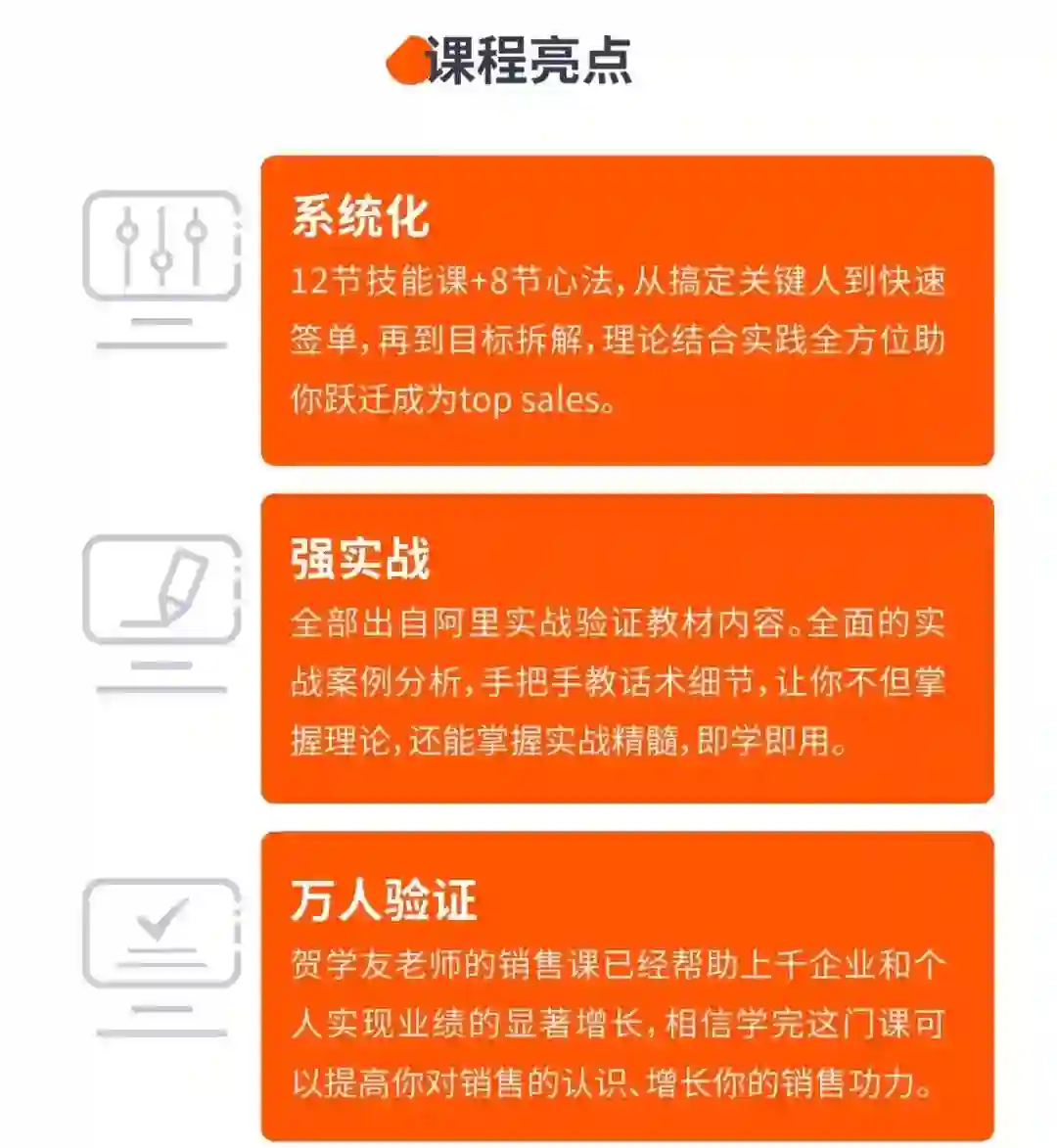 贺学友老师销售课程的架构思路,更多是从他作为“全球销冠”的经验出发,为你呈现他在无数实战中,提炼总结的“强实战”顶级销售心法、思路,重构高效销售流程,目标管理销售过程的可复制、落地、执行的销售方法。