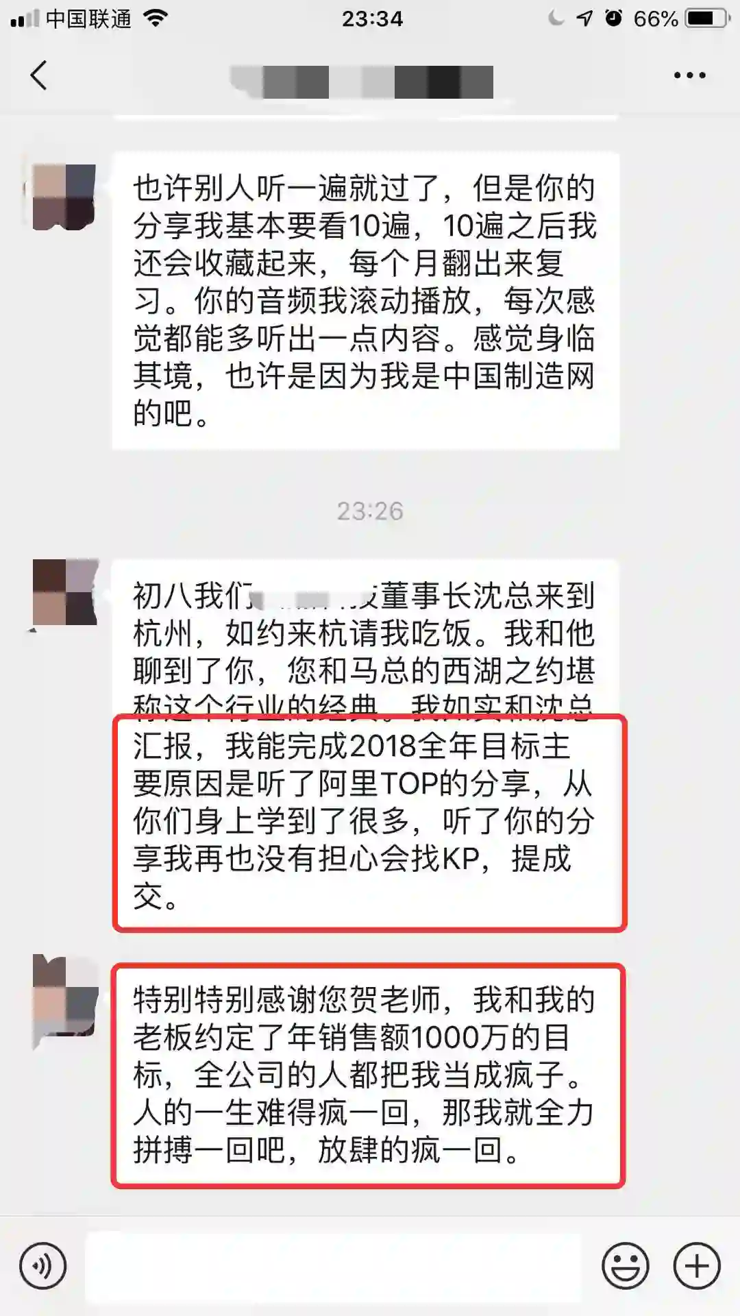 1.我曾经是贺老师的助理,在贺老师的鼓励和辅导下从助理角色转做了Sales,一直沿用贺老师指导的方法不到半年时间成功做到了全国topsales。到现在做到了阿里巴巴某事业部的总监,衷心感谢生命中能遇见贺老师,让我的人生有了如此大的转折!(阿里巴巴杭州团队 张XX)
