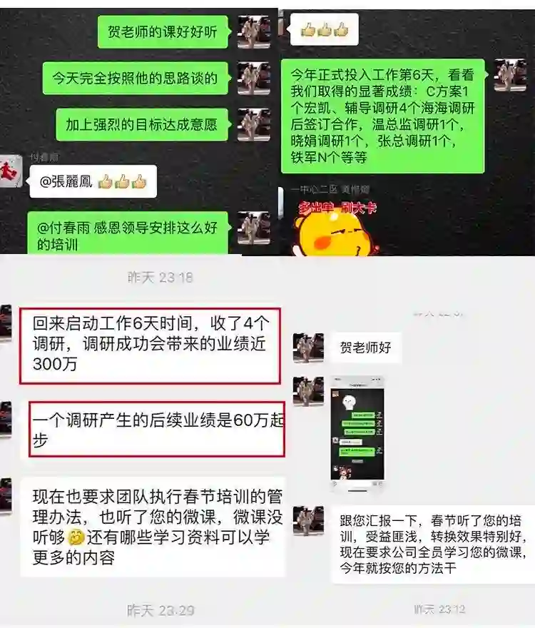 3.通过学习贺老师的线上微课《阿里销冠贺学友:销售实战20讲》,从不敢为到销售心法敢为之的心法突破,一天拿下2单合计216万多订单合同。(网上山东学员颜XX)