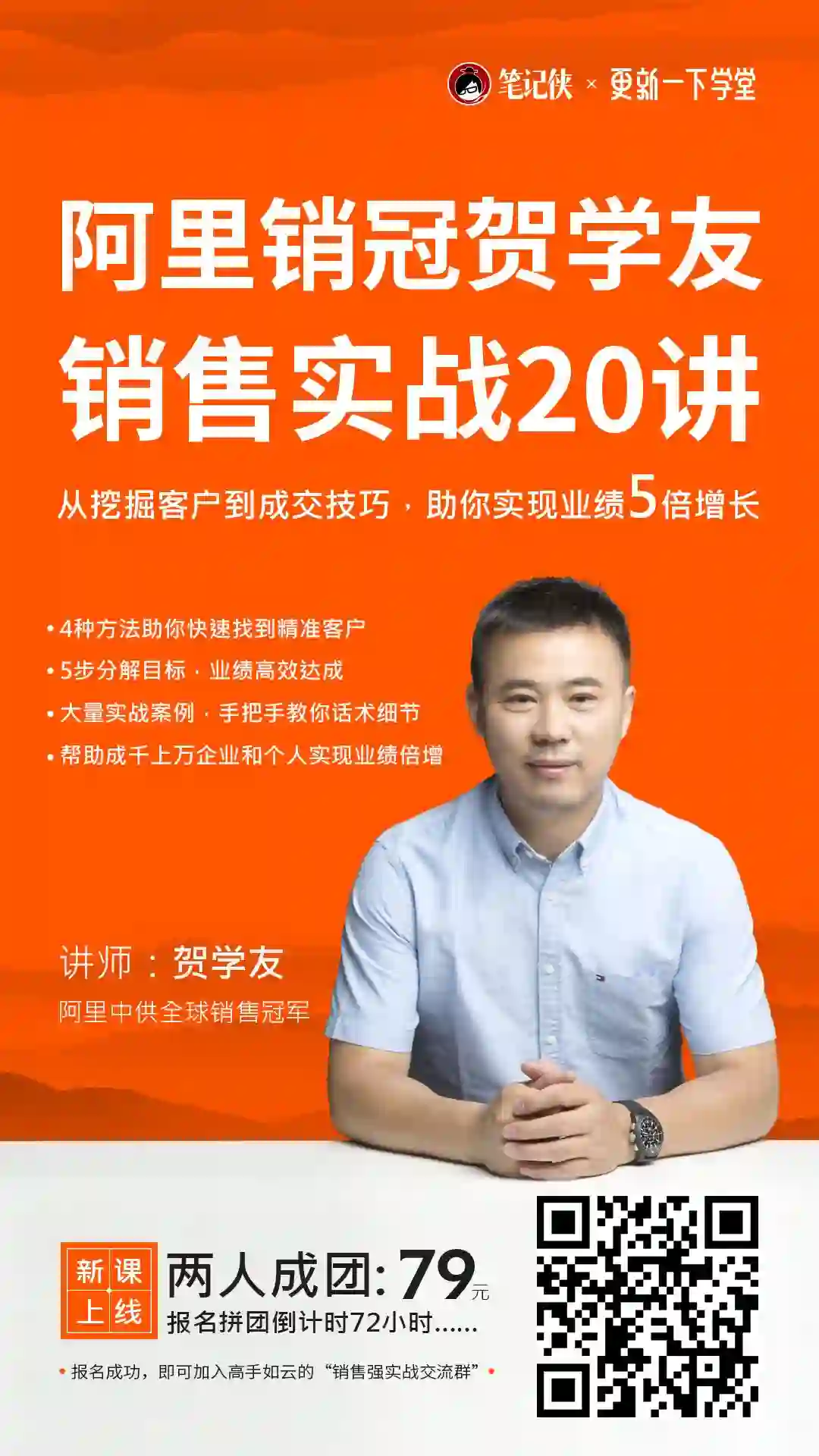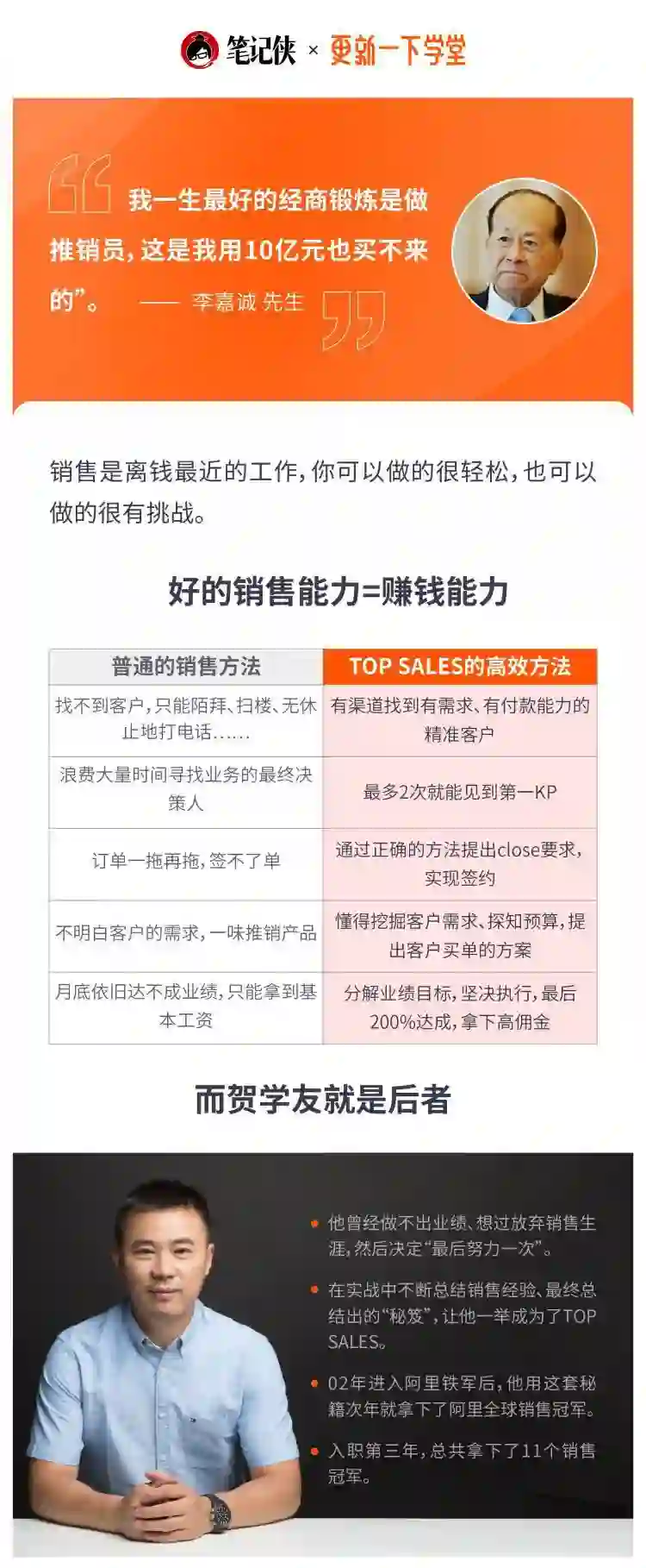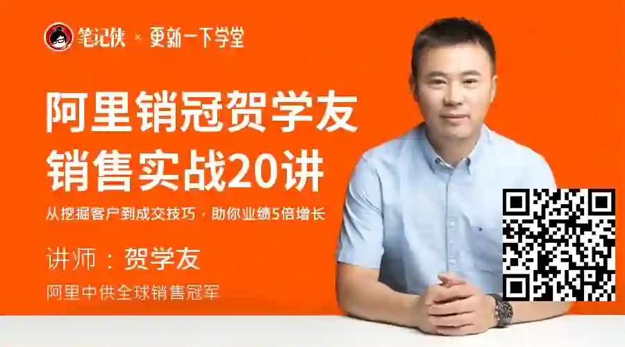 为了交付你“阿里中供全球双冠王”贺学友的销售方法论,我们把这位有10多年一线销售实战&管理经验,帮助无数业绩垫底sales,成为百万收入Top sales的“世界级顶尖销售”,邀请到笔记侠。