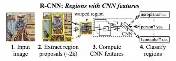 在OverFeat提出不就,伯克利大学的Ross Girshick等人就提出了RCNN(基于区域的卷积特征)[9],它在目标检测比赛上相比其他方法取得了50%的性能提升。他们提出了一个三阶的方法: