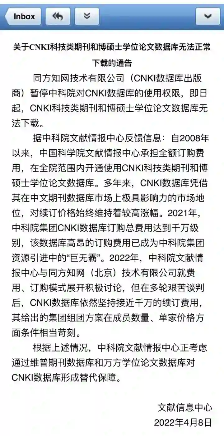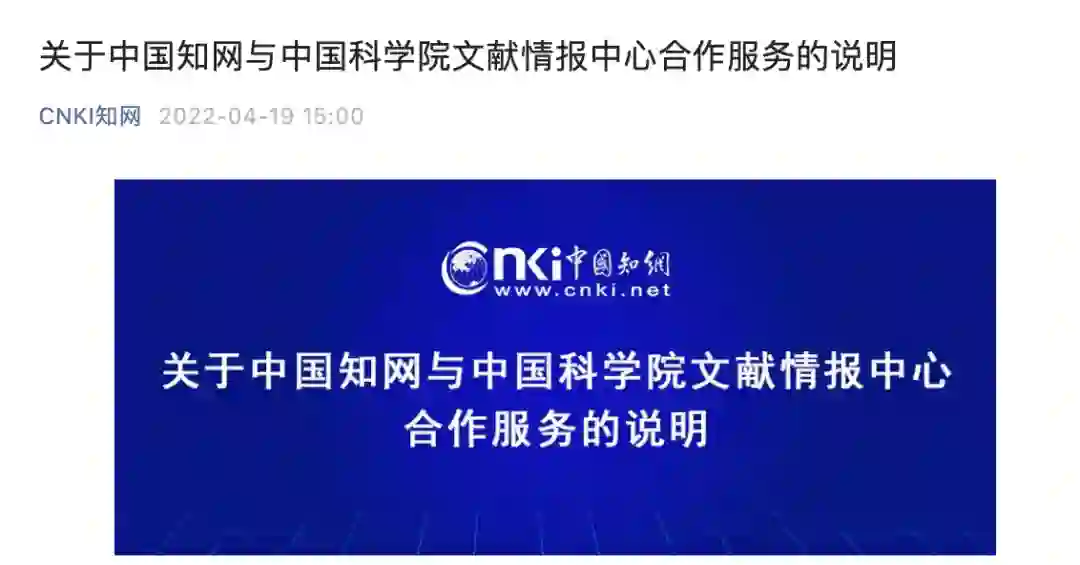 4 月 19 日下午,知网在其官方公众号上就「与中国科学院文献情报中心合作服务的说明」进行了正式回应。知网称将继续向中科院所属各院所提供正常服务,直至 2022 年度协议签署并启动服务。