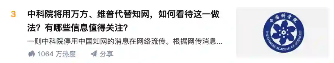 这周一,中科院和知网都对此事进行了初步回应。中科院表示,停用消息属实,并将用万方、维普替代知网。知网方面最初只简单回应了消息「不属实」。经过了几天的发酵,关于中科院与知网的相关讨论仍然在知乎热榜上。