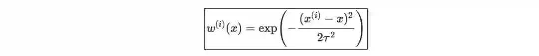 局部加权回归(LWR)—是线性回归的一种变体,它将每个训练样本的成本函数加权为w(i)(x),用参数 τ∈R可定义为: