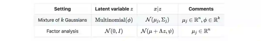 隐变量—是指使估计问题难以解决的隐藏/未观察到的变量,通常表示为z。下表是涉及到隐变量的常用设置: