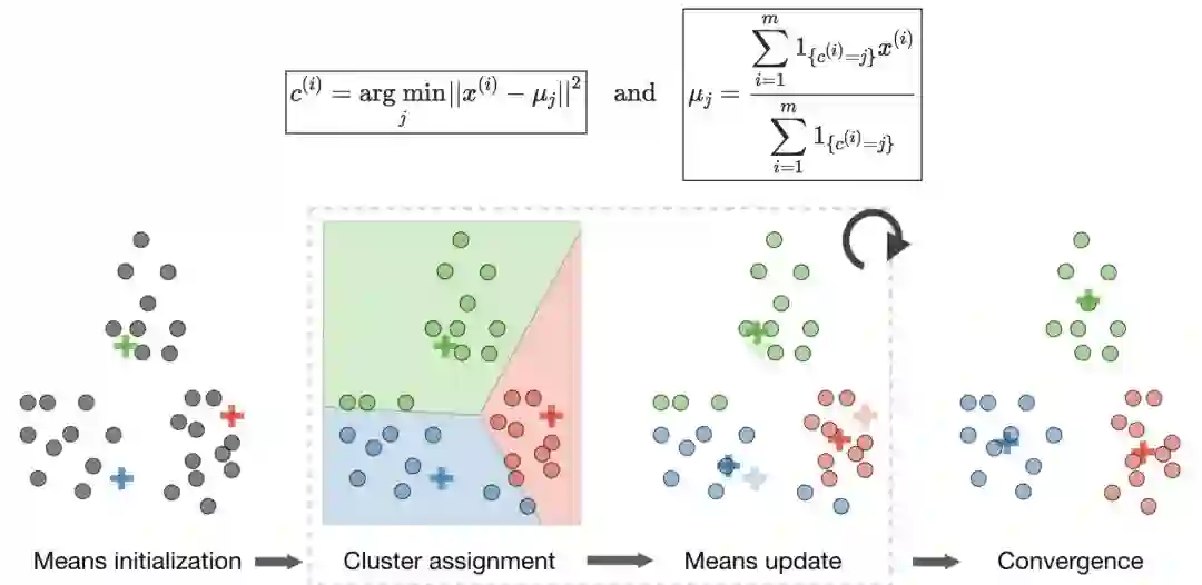 算法—在随机初始化聚类质心μ1,μ2,...,μk∈Rn之后,k均值算法重复以下步骤直到收敛: