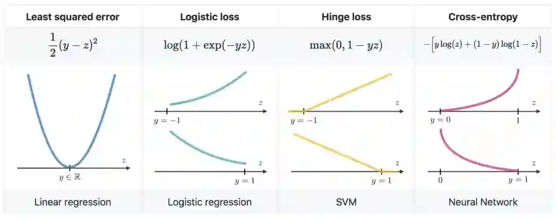损失函数—一个损失函数可表示为L:(z,y)∈R×Y⟼L(z,y)∈R,它将与实际数据值y对应的预测值z作为输入,并输出它们之间的差异。常见的损失函数归纳如下: