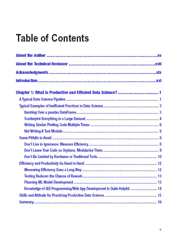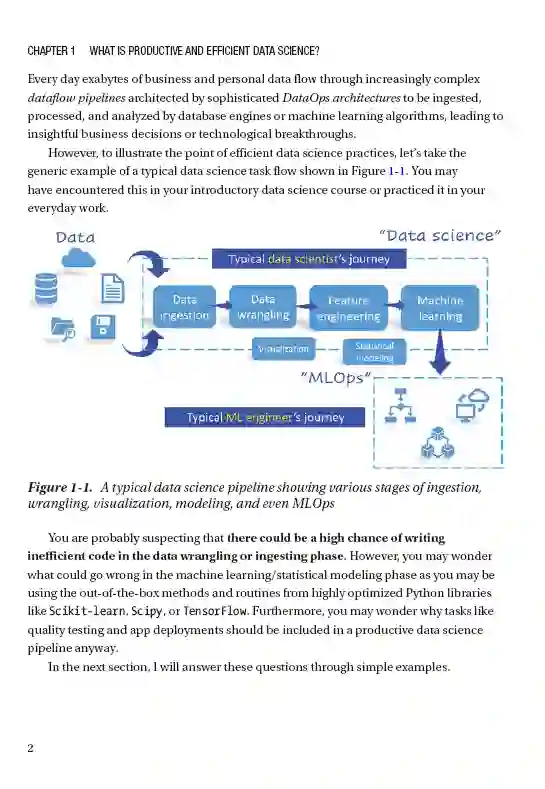 您将回顾日常业务流程中潜伏的低效率和瓶颈,并使用实际的解决方案来解决它们。重复数据科学任务的自动化是贯穿全书的一个关键思维模式。您将学习如何在Python生态系统中已经存在的高级库和包的帮助下扩展现有的编码实践,以高效地处理更大的数据集。