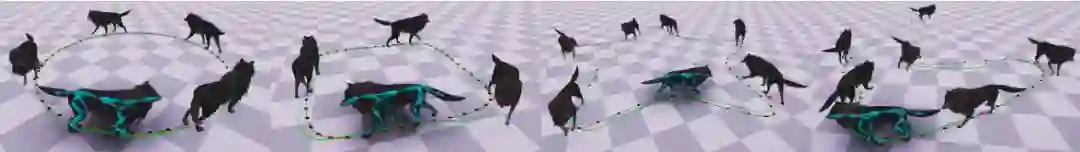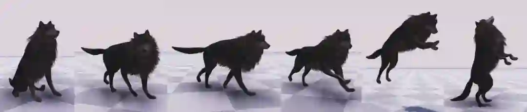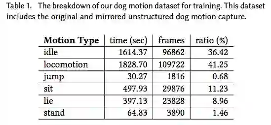 研究人员使用狗的动作捕捉(Dog Motion Capture)作为训练数据。这些数据包含各种运动模式,例如步行、踱步、小跑、跑步等,以及其他类型的动作,例如坐、站、闲散,躺着和跳跃。通过镜像将数据规模加倍。