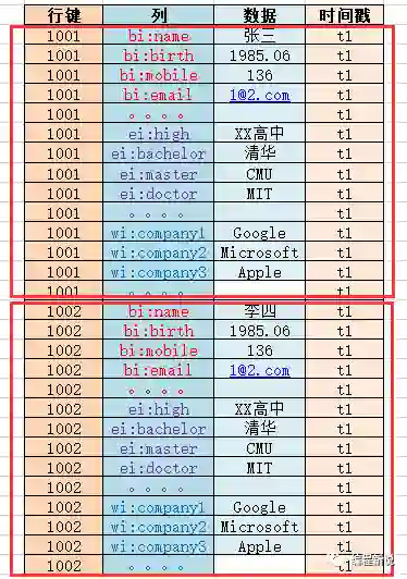 一个行键、一到多列(包括数据)组合起来叫做一行(Row)。下图中所有1001的数据合起来相当于Hbase中的一行,1002的相当于另一行: