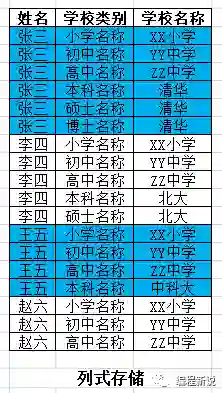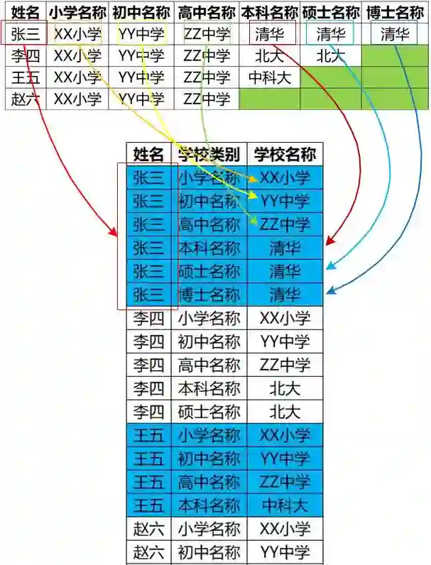 原来的六列数据是在一行,所以共用一个主键(即张三)。现在变成了六行,每行都需要一个主键(不然不知道这行数据是谁的),