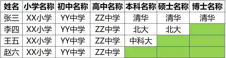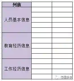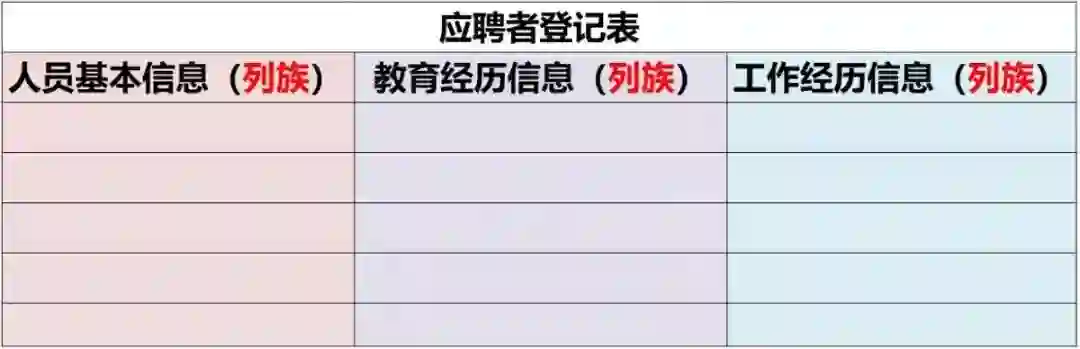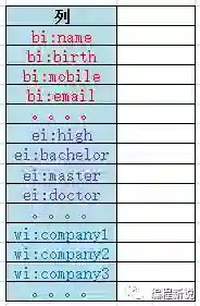 一个非常常见的例子,去面试的时候,一般前台MM都会让填一张表,通常信息很多,每个公司又不尽相同。但大致可以分三类:人员基本信息,教育经历信息,工作经历信息,这三个类别其实就相当于三个列族。如下图: