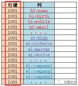 在传统数据库中每一行的唯一标识符叫做主键,在Hbase中叫做row key(行键)。如下图: