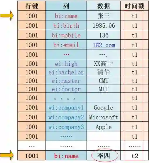 在t1时间我存入一个人的基本信息,之后发现姓名错了,在t2时间又更新了姓名,此时并不会去更新原来的那条数据,而是又插入了一条新数据且打上新的时间戳。