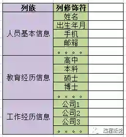每个类别里都会有具体的信息,比如人员基本信息里有姓名、电话、出生年月等,它们就相当于一个个标识符(变量名),在Hbase中叫做Column Qualifier(列修饰符)。列修饰符位于列族里面用来标识一条条数据。如下图: