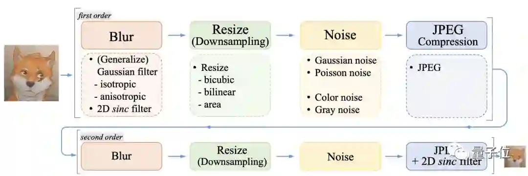 原理方面,研究人员引出了高阶退化过程来模拟出更真实全面的退化,它包含多个重复的经典退化过程,每个又具有不同的退化超参: