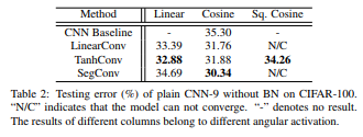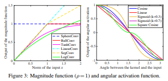 注意,这个表格当中,每一行都是一个 卷积操作子也就是 h(.)Norm函数,每一列都是一个 角度激活函数g(.)。因此,如之前所说,对于一个一般CNN 就是g(.)=Cosine。