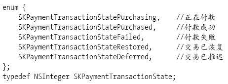 这两个方法传入的参数都是一个SKPaymentTransaction类型的数组,每一个SKPayment- Transaction代表着一个支付交易对象,应用程序要明确地处理每个交易对象的返回结果,根据它的transactionState属性来判断交易是否成功。如果transactionState的值是SKPayment- TransactionStatePurchased,则表示交易成功,此时程序应该向用户提供收费成功后的功能;如果transactionState的值为SKPaymentTransactionStateFailed,则表示交易失败,应用程序应该获取交易失败的错误信息并反馈给用户。交易的状态是一个枚举值,定义如下: