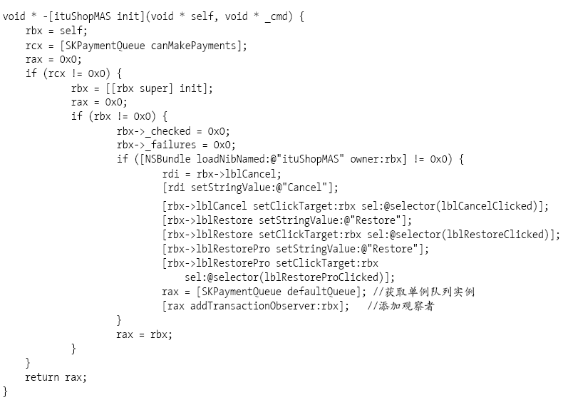 defaultQueue()方法返回一个单例的SKPaymentQueue实例,它是一个队列结构,由App Store去处理。操作完成后,产品支付请求就加入到支付队列中了。要想处理支付的状态,例如购买成功、购买失败、购买取消等处理的逻辑,就需要为队列添加一个观察者。当队列中交易的状态被更新,或者当交易从队列中删除的时候,观察者应该能正确及时地处理所有的交易信息,并根据交易的结果为购买成功的用户提供相应的功能。添加观察者的操作要在addPayment()调用前完成,通常是在程序的初始化时完成的,代码如下所示: