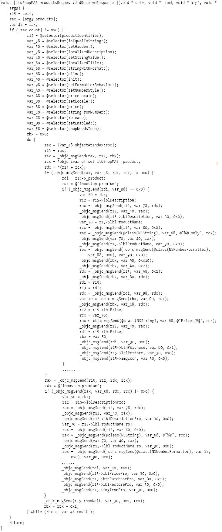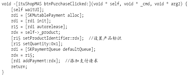 SKProductsRequest 构建完成后,再为它设置一个代理delegate,用来处理返回的信息。最后调用它的start()方法。从App Store中下载一个App,查看相应的伪代码,如下所示: