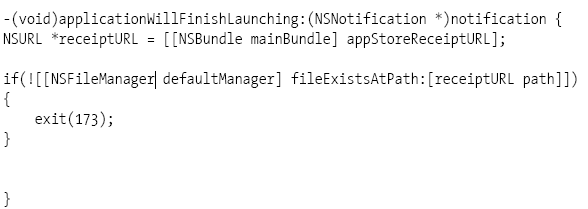 Signature。签名信息。验证签名,可以检测当前的Receipt是否有效,或者是否已经更新了。苹果在开发文档中指出,开发人员应该在程序启动时,检测Receipt是否有效。如果无效,程序应该调用exit(173)退出,系统收到173退出码后,会自动联网请求去刷新Receipt。相应的Objective-C代码如下: