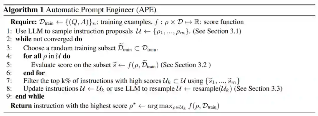 直观地说,本文提出的算法要求 LLM 根据演示生成一组指令候选,然后要求算法评估哪些指令更有希望,并将该算法命名为 APE(Automatic Prompt Engineer)。