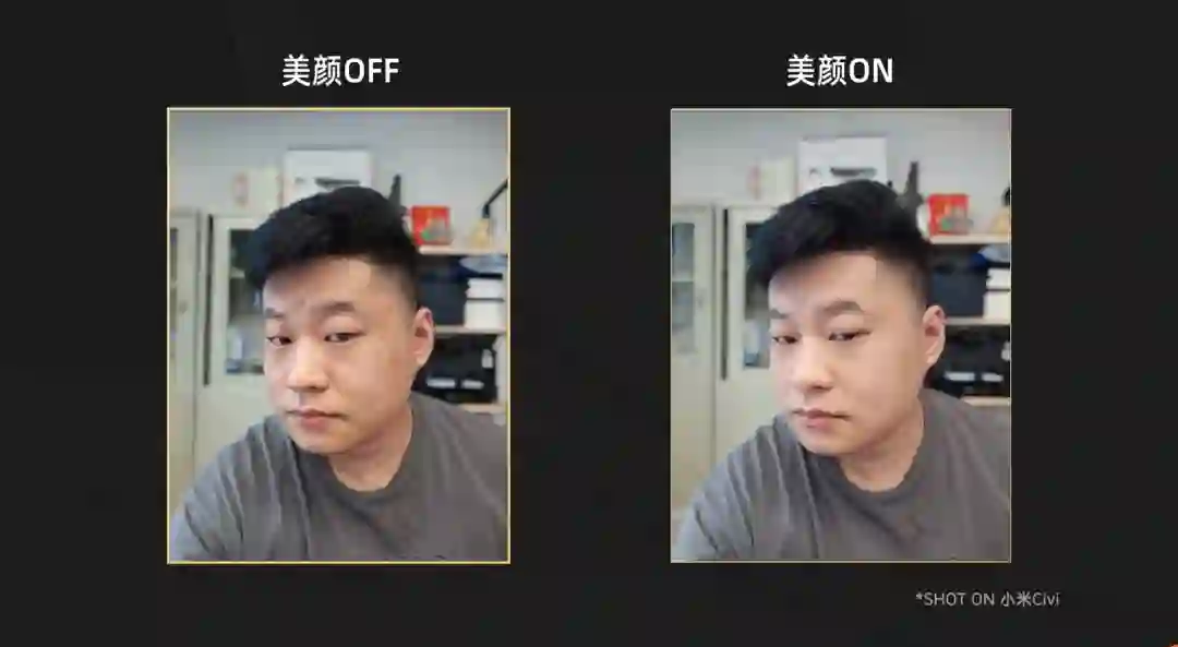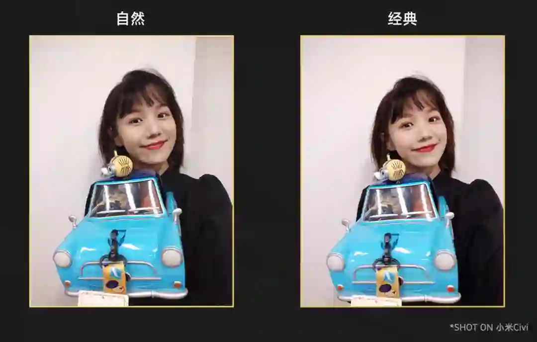 在默认的自拍界面里,小米 Civi 提供了自然和经典两种自拍模式,自然模式突出面部结构和五官轮廓,保留更多的皮肤原始特征和纹理,经典模式呢就是带了简单的「气色妆容」,两种模式各有千秋,按需选择即可。
