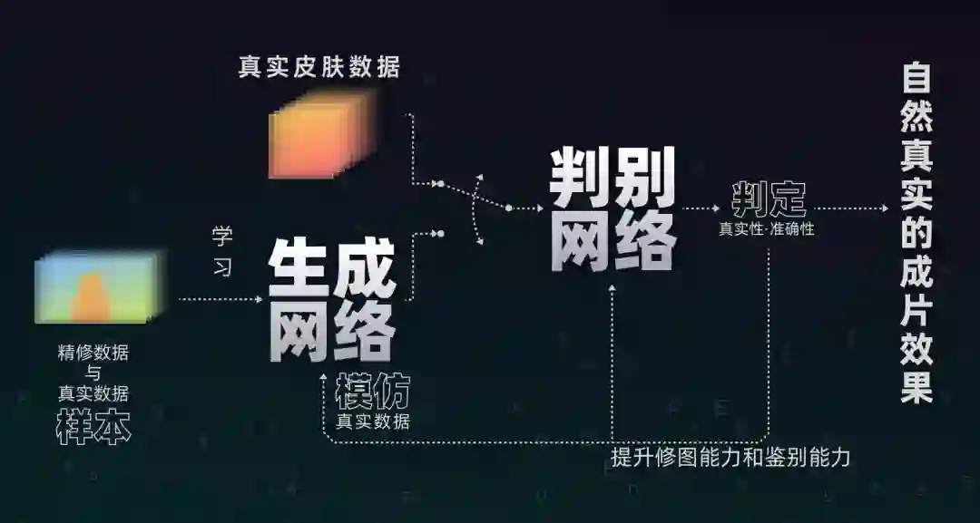 这项技术的背后是小米采用的 GAN 生成对抗网络,由「生成网络」和「判别网络」互相对抗,共同进步,通过人工智能来判别最终输出的成片是否是接近真实皮肤数据,最终的目的是让皮肤看起来更自然。