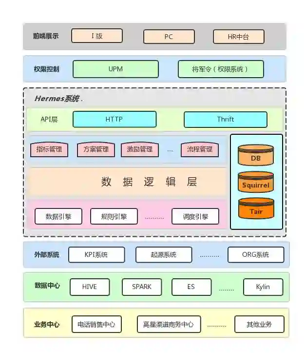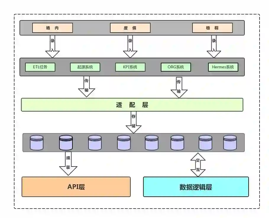 API层是我们对外提供数据的核心层,我们会为总部和HR中台提供一些绩效数据。而数据逻辑层则负责Hermes系统内部的逻辑计算,会将计算结果回写到数据库和缓存中。