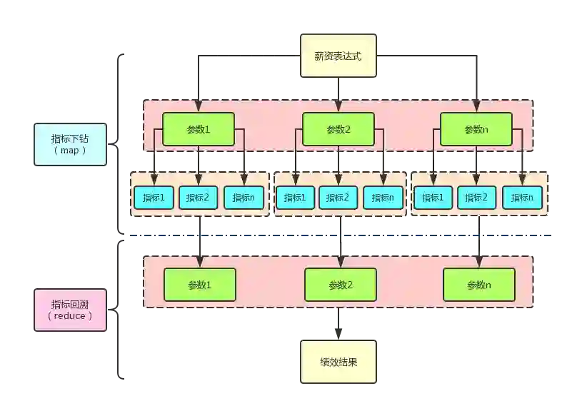 此处实现了参数粒度的并行计算,接下来再进行指标级别的下钻。若该处的指标为复合指标时,计算引擎会继续下钻到基础指标级别;待所有的指标计算结果就绪后,会触发计算引擎的回溯计算流程(类似Hadoop中的reduce过程),依赖于各指标的参数因子会被计算并保存。当各参数因子准备就绪时,直接生成绩效最终结果。