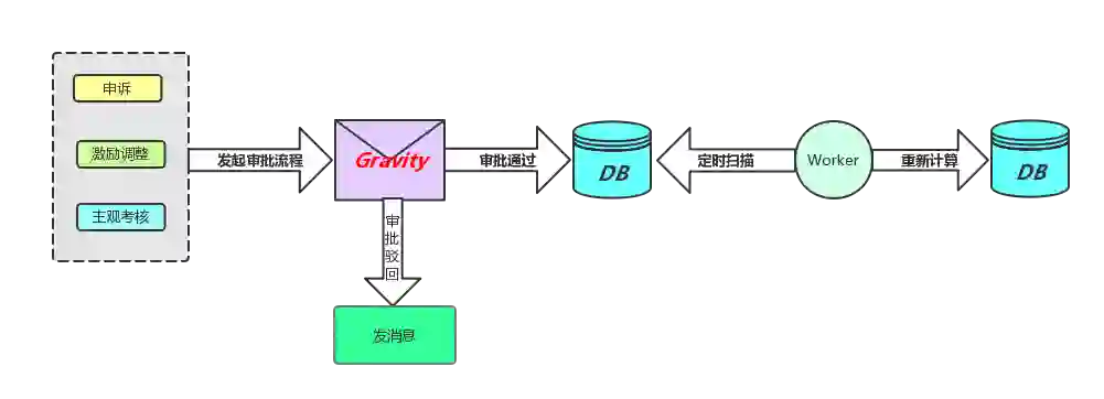 审批如果被驳回,我们会通过大象通知流程发起者;审批通过时,我们一方面会通知流程发起者,另一方面我们会把审批的详细信息存入到一张中间表中。然后通过定时调度引擎来定时扫描该表中的数据,目前是10分钟一扫描,然后依据审批信息重新计算相关人员的绩效数据,最终更新数据库中的信息,完成申诉、激励调整和主观考核的流程。