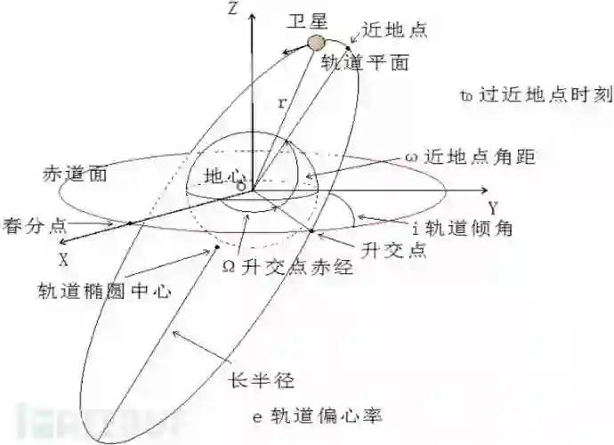 卫星的轨道的6要素分别为:轨道倾角(i)、升交点赤经(Ω)、近地点幅角(w),偏心率(e)、半长轴长度(a)近地点时刻(τ)