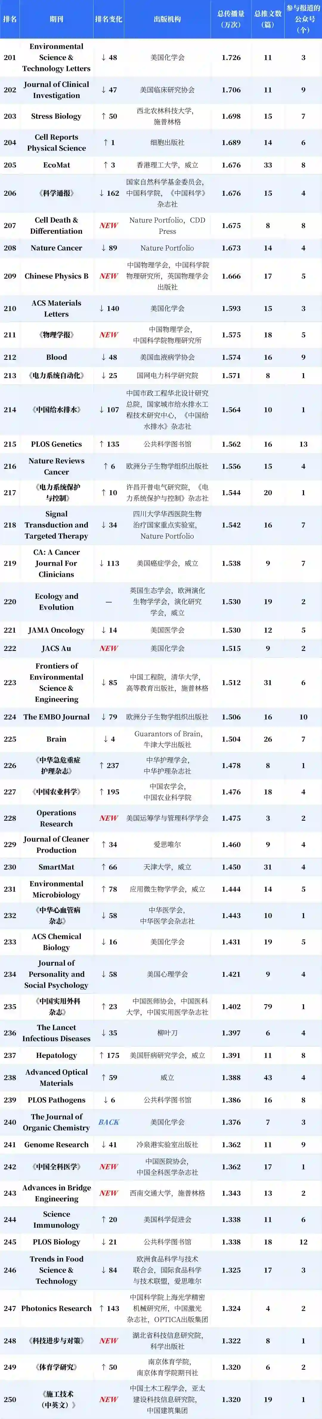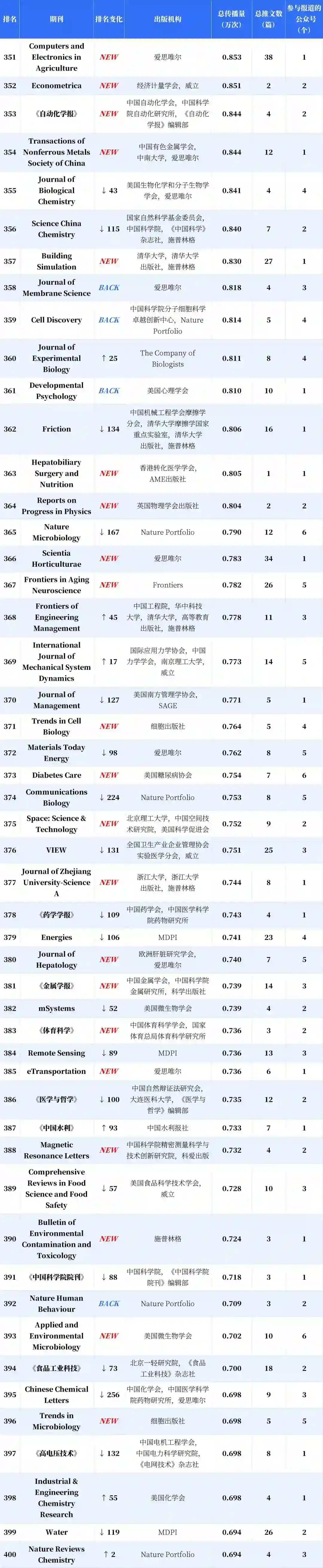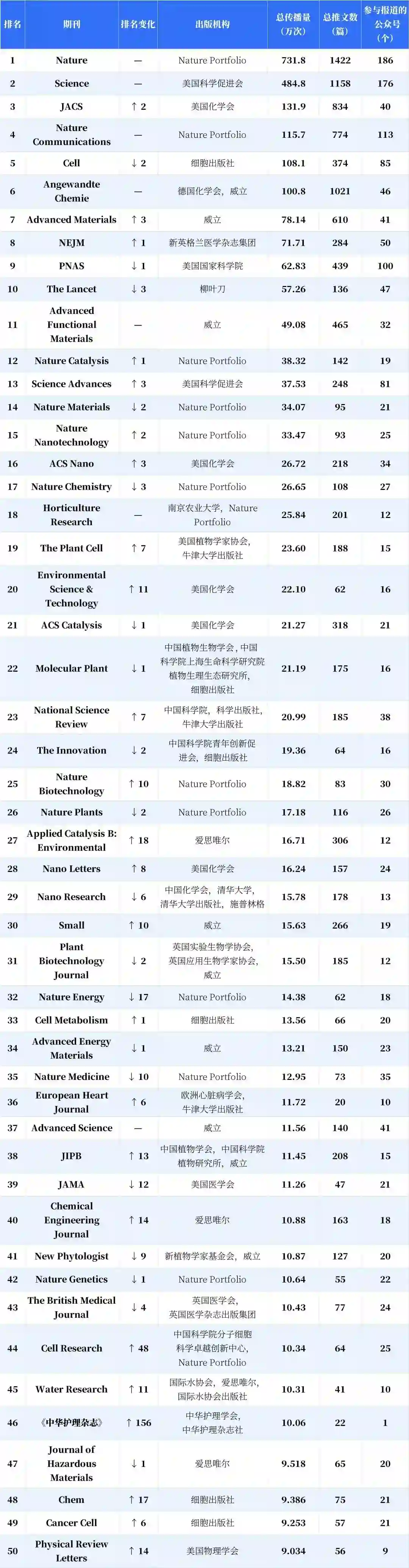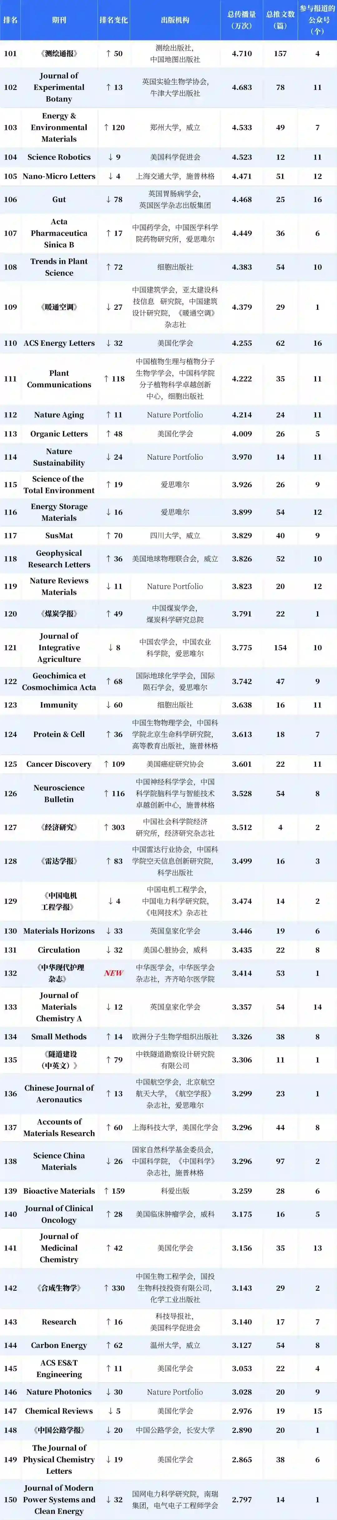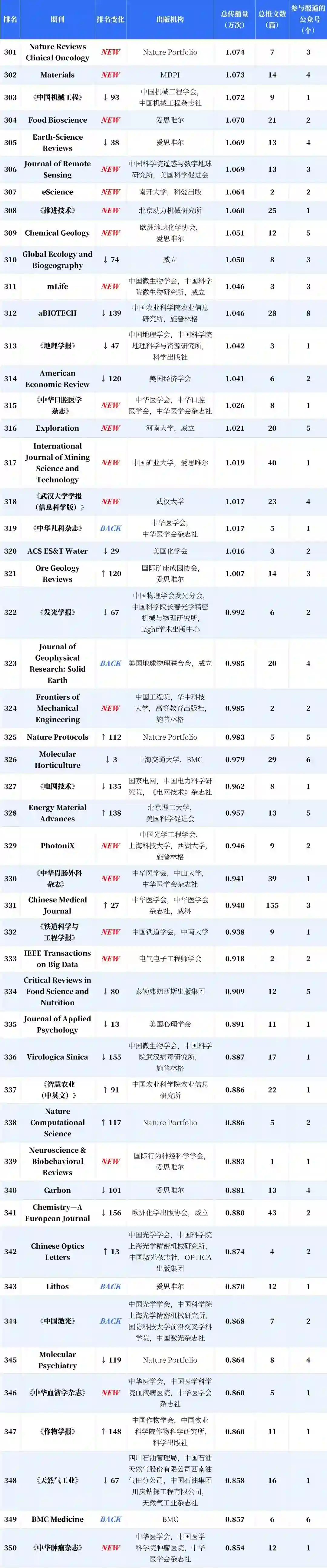 分析显示,新入榜的中国期刊有 53.43%的传播力来自新收录公众号,海外期刊的这一指标仅为 10.28%;与之对应,这批新收录的公众号产生的期刊传播力中,有 84.17% 流向了新上榜的中国期刊。得益于收录公众号总量的增加以及数据计量精度的提高,更多参与期刊传播或推广的微信推文被纳入计量范围,这带动了榜单的总传播量提升,入榜期刊的刊均传播力因此整体上升,而中国期刊的升幅达 19.57%,显著高于海外期刊。