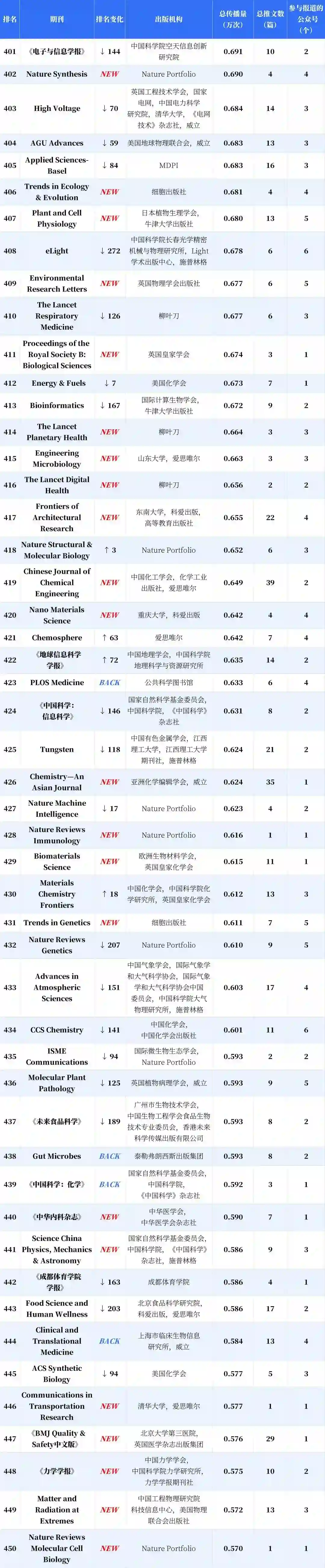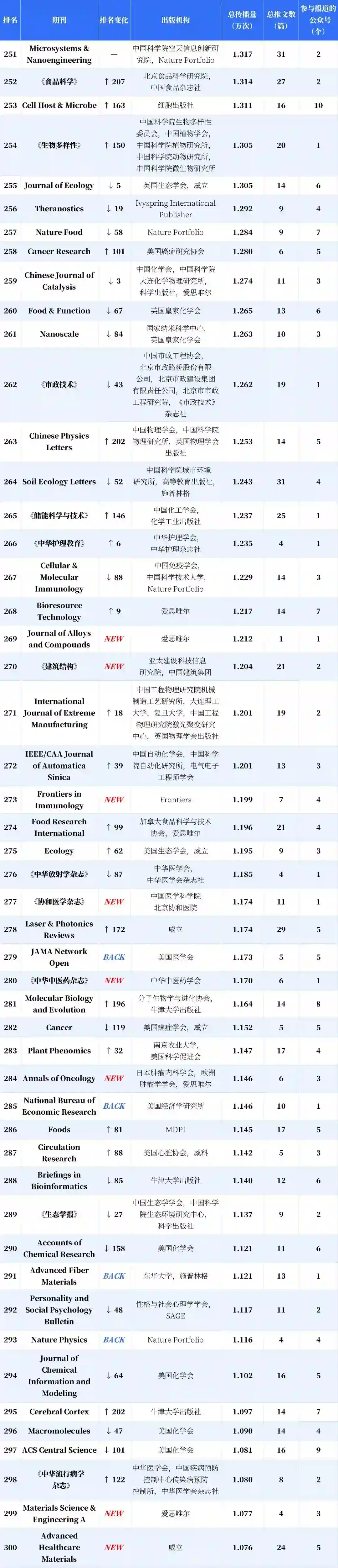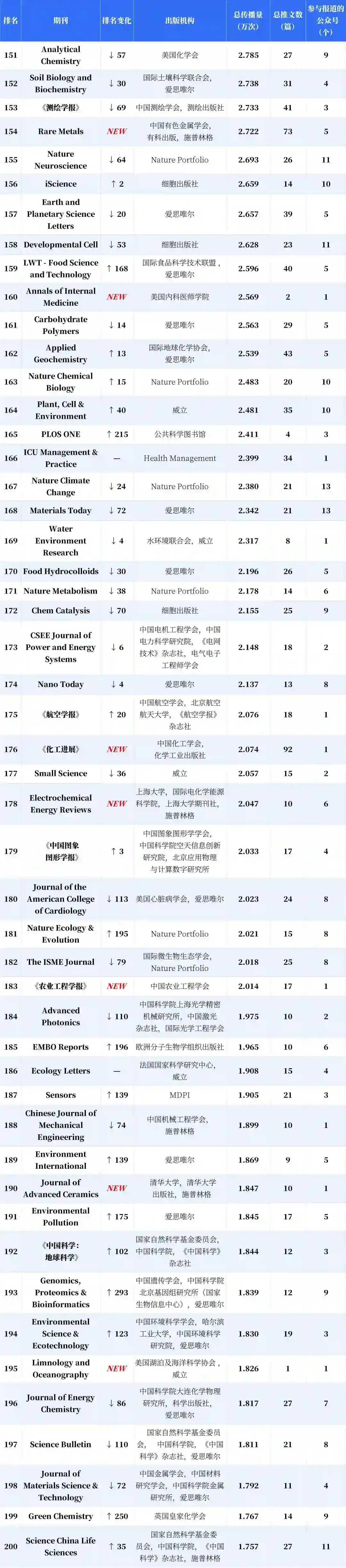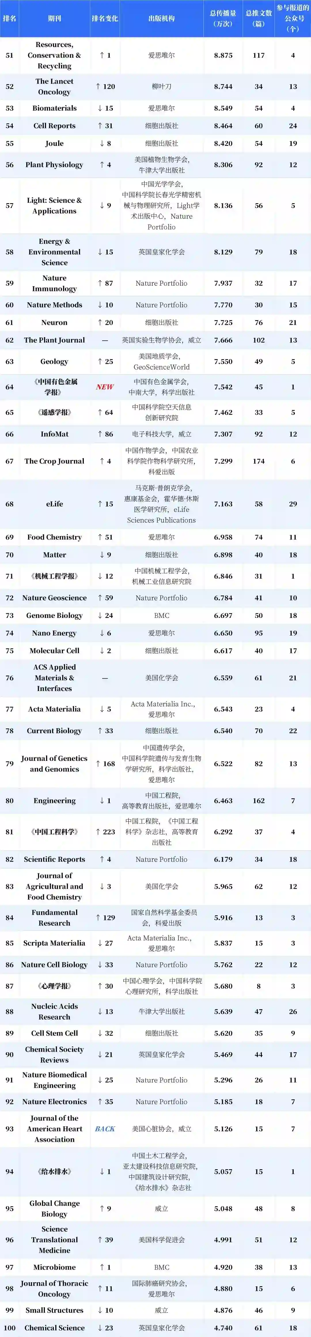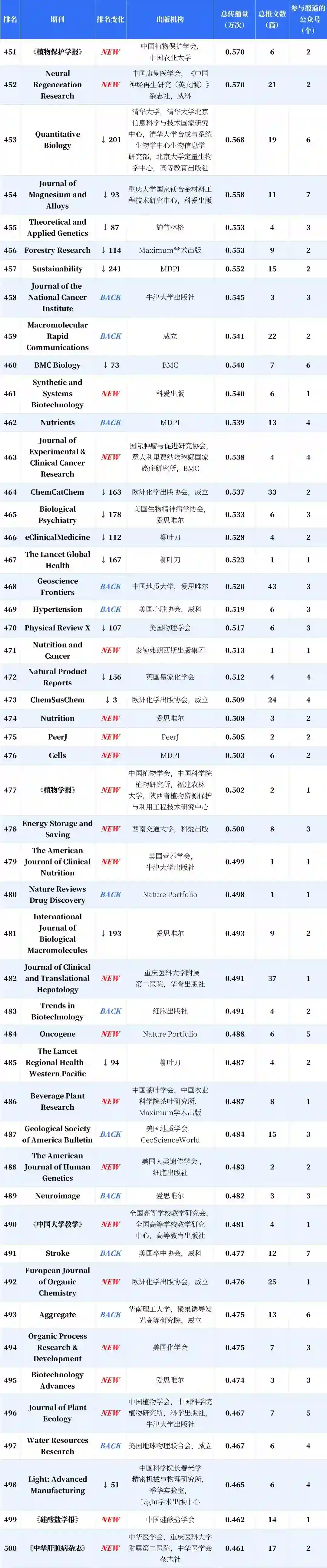 分析显示,新入榜的中国期刊有 53.43%的传播力来自新收录公众号,海外期刊的这一指标仅为 10.28%;与之对应,这批新收录的公众号产生的期刊传播力中,有 84.17% 流向了新上榜的中国期刊。得益于收录公众号总量的增加以及数据计量精度的提高,更多参与期刊传播或推广的微信推文被纳入计量范围,这带动了榜单的总传播量提升,入榜期刊的刊均传播力因此整体上升,而中国期刊的升幅达 19.57%,显著高于海外期刊。