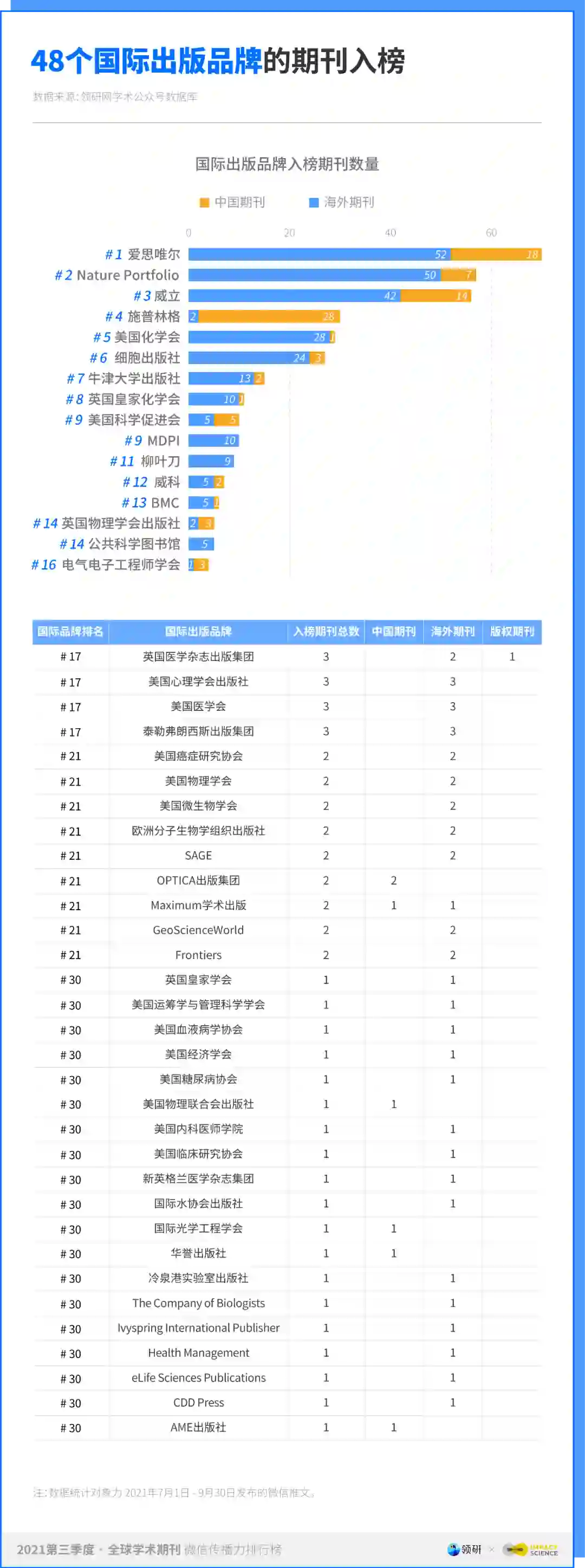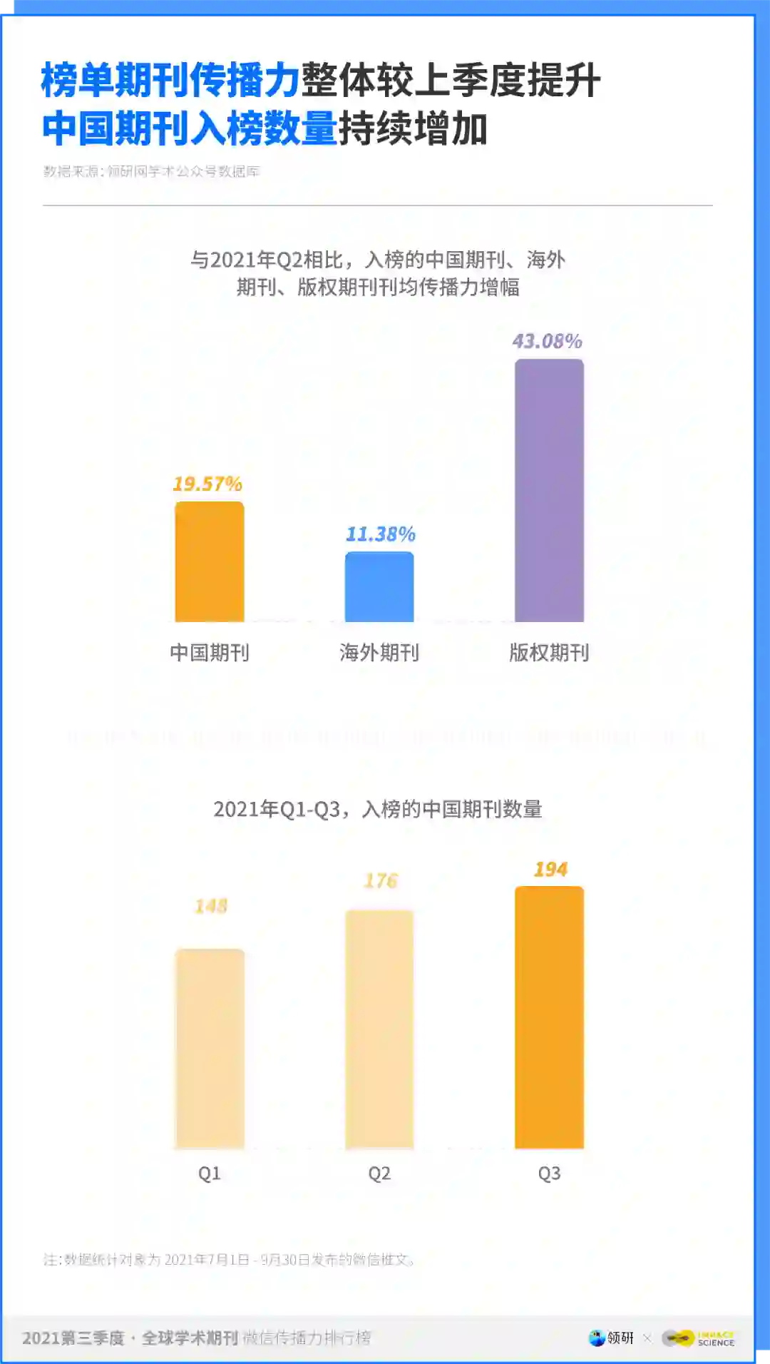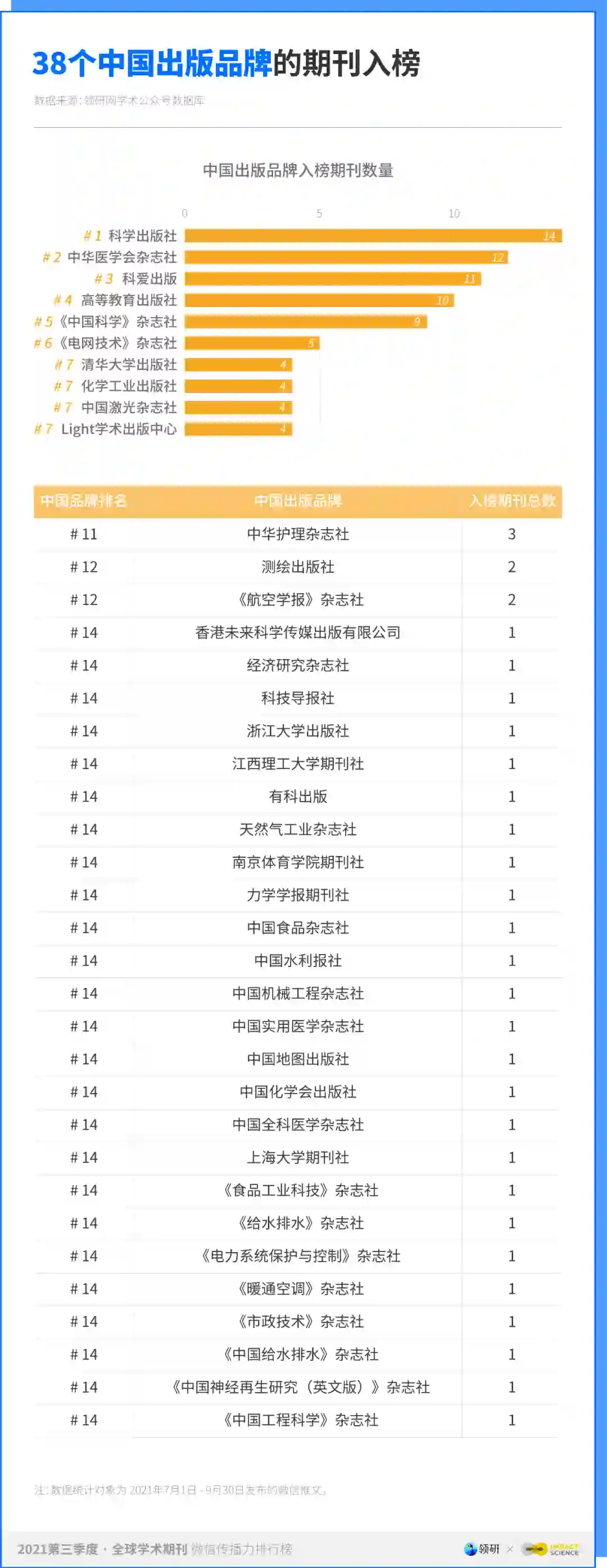 本榜单数据来自领研网学术公众号数据库。2021 年第三季度榜单共采集 934 个具有影响力的各学科学术公众号,收录并分析其在 2021 年 7 月 1 日 - 9 月 30 日间发布的推文 10 万余篇。