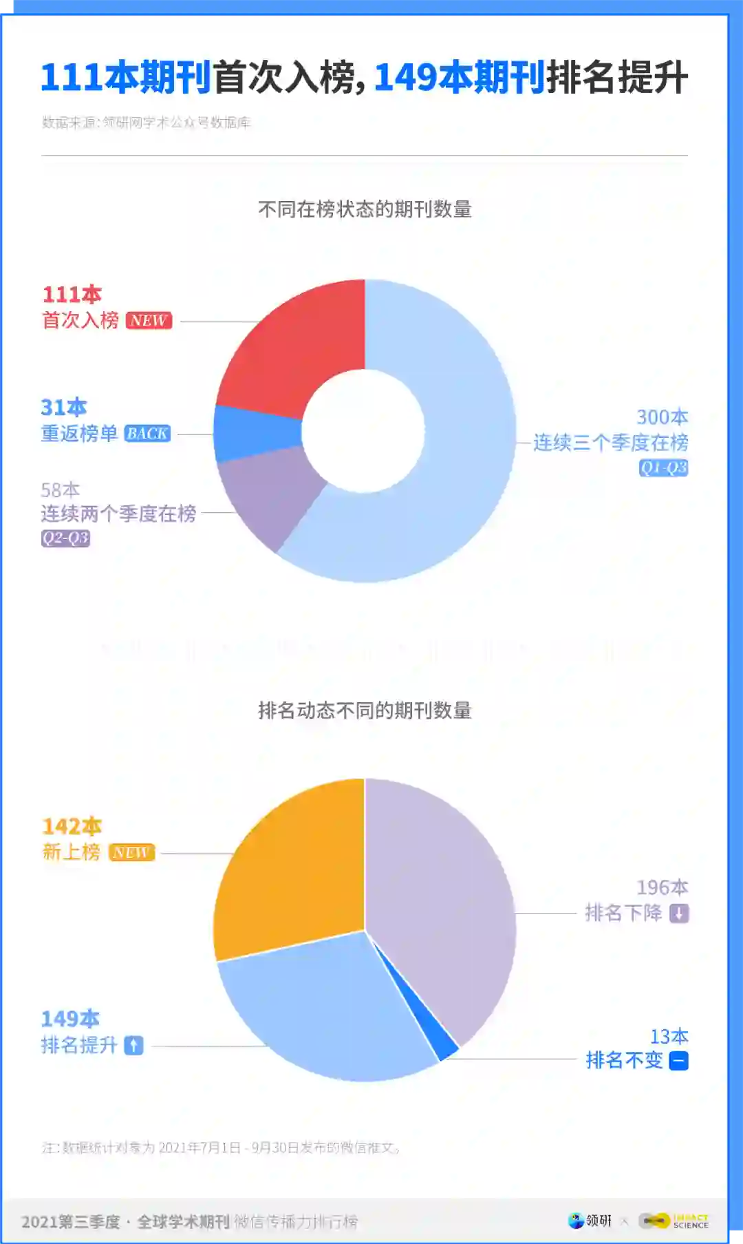 2021 年第三季度,领研全球学术期刊微信传播力榜继续保持动态变化,111 本期刊首次登上榜单,31 本期刊在第二季度缺席后重返排行,六成期刊连续三个季度持续在榜。期刊排名方面,位次提升的期刊占 58.2%,包括 142 本新上榜期刊和 149 本连续在榜期刊;另有 196 本期刊排名下降,仅有 13 本期刊排名与上季度相同。
