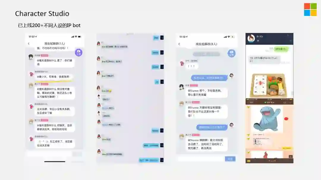 目前,我们已经上线了200+不同IP的Chatbot,如第二个,是"妲己"对话机器人,是我们跟QQ一起合作的,妲己除了是历史人物,也是王者荣耀游戏中的角色。为了活跃整个游戏群的生态,我们就做了"妲己"对话机器人,把历史上的妲己跟游戏中的妲己叠加起来,既可以问和游戏中技能相关的问题,也可以聊历史中关于妲己的话题。