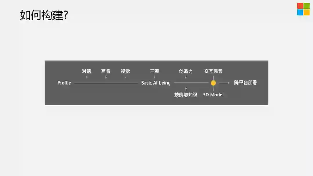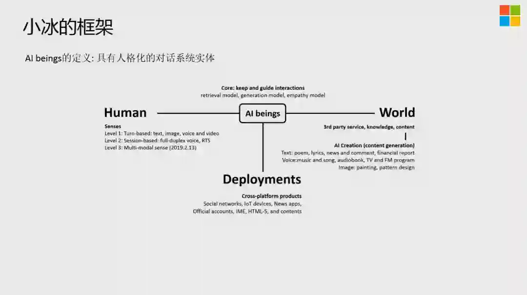 AI beings是处在T字形中间的状态,左边是Human与人的交互,这里存在3个Level的Senses,基于文本、图像、声音,基于全双工,以及基于多模态的;右端是尽可能的把物理世界的知识、content加进来,在这里还有AI创作的模块,根据人格化的定义,赋予AI beings自己的能力和气质,可以写诗。写歌、唱歌等等,相比于决策,AI创作更容易实现;最后是Deployments,跨平台。