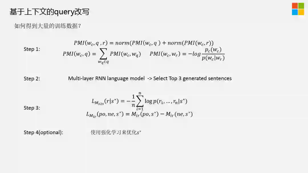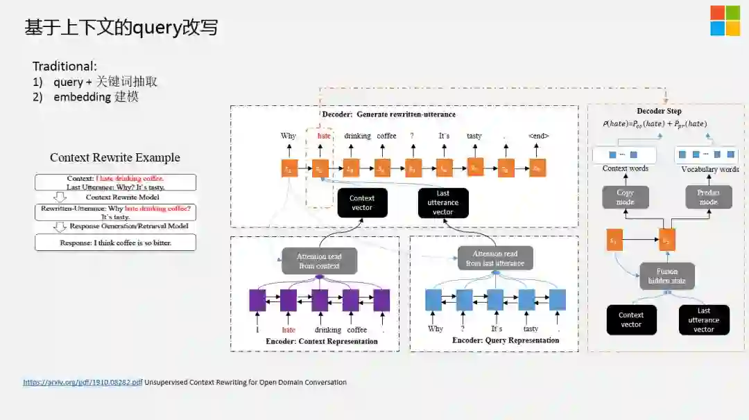 对于这个Task,难点在于如何得到大量的训练数据。在互联网上,有大量的长片段的Session对话,但是你要把这种端到端的 ( 给定的Context跟当前的Query ) 改写好的response很好的抽出来,但是,数据量还不是特别大。