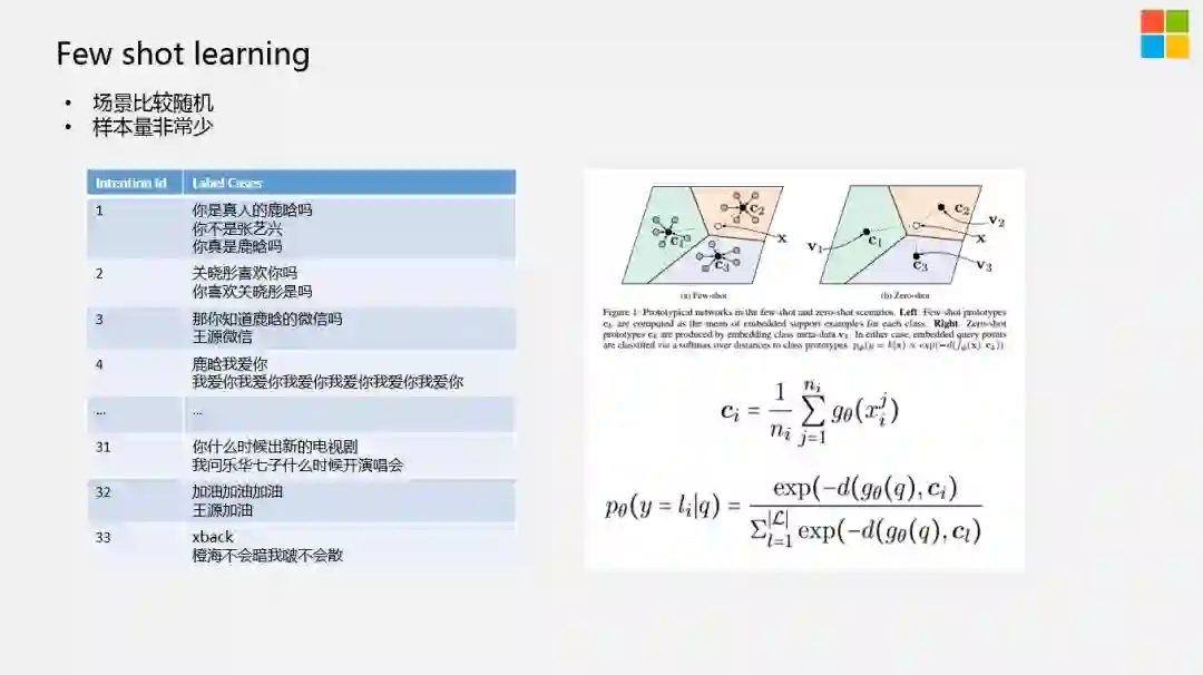 这样做有一个好处:当有新的类别加进来之后,整个模型并不需要进行特别多的改动,对于这种比较随机的场景,每天可能新增十几种新的意图,但是增加一个新的意图,并不需要再显示的重新训练模型。因为原型网络这种方式,已经在帮你尽可能的对样本做很好的建模。所以在实际系统中,我们基本上能做到20分钟以内,只要把意图构建好之后,就能把整个model重新推上线,非常的快。