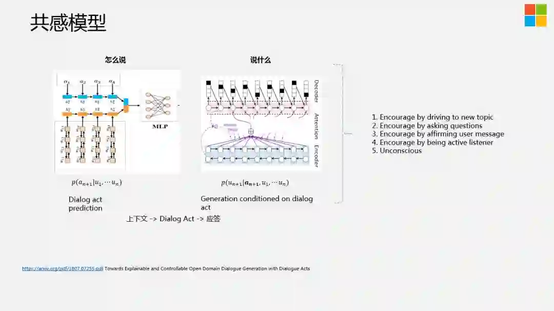 我们引入了Dialogue Act概念,在这里,我们有比较宽泛的七大类的Act,比如我们是应该follow用户的问题,还是针对用户的问题,问一个新的问题,或者直接拒绝回答用户的问题,这是一大类。还有一大类,是发现当前的Session聊得不太好了,需要更多的引入新的话题,新的话题有可能是饭,也有可能是问题等等。通过这样的方式,我们可以比较好的建模对话的节奏。